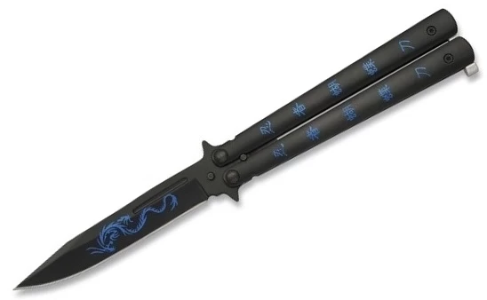 Le Balisong couteau papillon dragon est là pour révolutionner votre expérience des loisirs ! Le Balisong couteau papillon dragon est un ultra-léger et robuste balisong à ouverture en papillon de la marque Albainox. Offrant une prise en main confortable et sûre, ce couteau de poche est doté d’une lame tranchante en acier inoxydable ainsi que d’un manche antidérapant en aluminium dépliable en deux. Il est également doté d’un verrouillage sécurisé en métal à la fin du manche et offre un design décoration : dragon et symbole japonais avec une couleur noire et motif bleu.