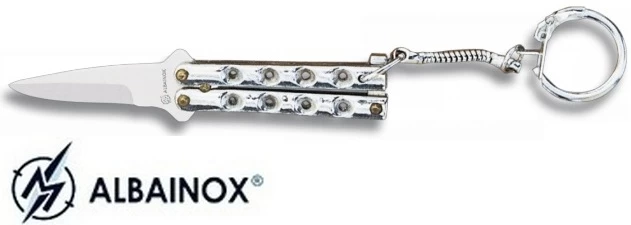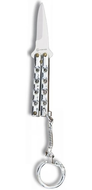 - Balisong porte-clé 8,8cm – Couteau papillon argenté.