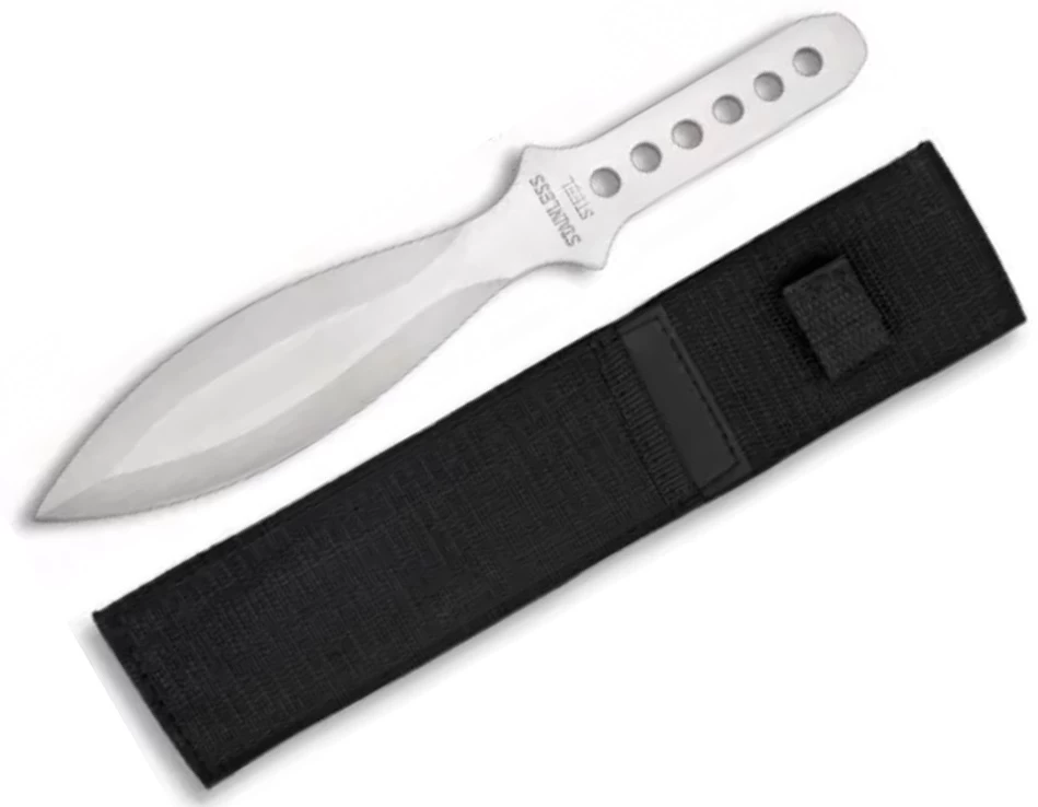 Ce couteau vous assurera un geste précis et avec un minimum de vibration sur la cible, grâce à sa conception full tang. Tout en acier inoxydable, ce couteau est très résistant, et, surtout, léger, critère important dans cette discipline, où vous êtes soumis à des entraînements réguliers et à une répétition dans le geste. Sa lame de 9 cm est aiguisée, et son manche est ergonomique, pour une bonne prise en main et un bon confort. Son design de rue est sobre et élégant, donnant un atout esthétique appréciable à cette arme de jet. Il est évidemment livré avec un étui de protection en nylon que vous pourrez passer à la ceinture.