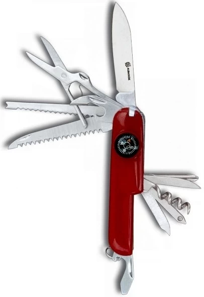 - Equipé de 12 outils : boussole, tire-bouchon, pointe, petite et grande lame tranchante, lime à ongle, tournevis plat et cruciforme, ciseau, décapsuleur et deux lames scie.