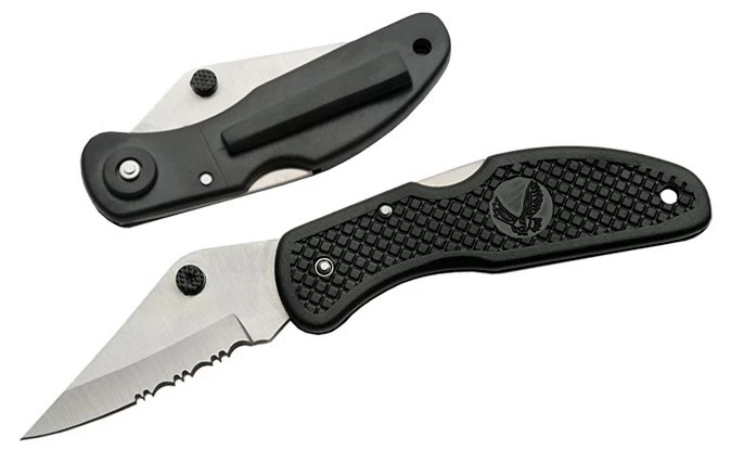 - Avis de Couteau Azur : Pour les baroudeurs et bricoleurs, un couteau pliant est toujours utile. Il permet d’effectuer diverses tâches, se nourrir, bricoler de petites choses. On a toujours besoin d’un petit couteau sous la main. C’est pourquoi, parmi notre gamme de produits, nous vous proposons ce petit couteau pliant noir, avec son manche en pvc antidérapant, à un prix défiant toute concurrence. Sa lame semi-dentelée de sept cm vous permettra de réaliser un large panel de petits travaux, de couper la viande, de tailler… Avec son poids plume et son clip pour la ceinture, il vous accompagnera partout en restant discret. On l’oublierait presque. Son ouverture est facile et il est muni d’un système de sécurité pour bloquer la lame dans la bonne position.