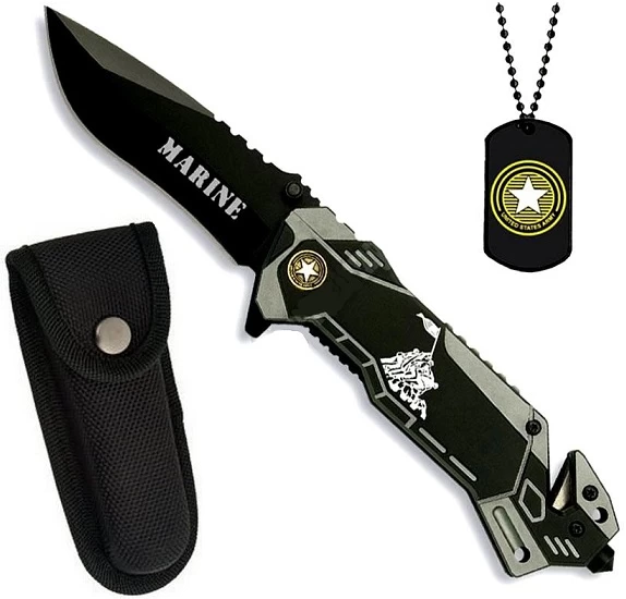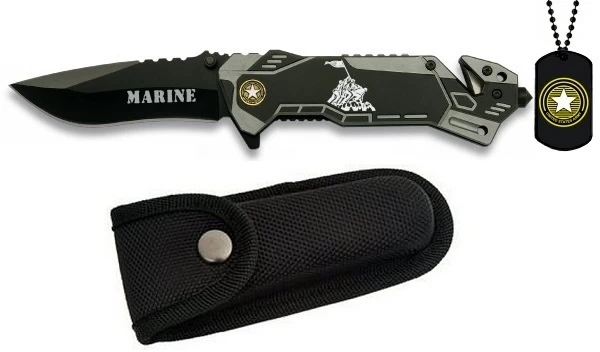 - Pack marine comprenant un couteau, une plaque en métal et un étui.