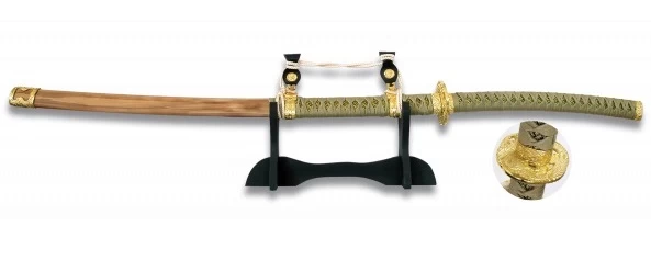 - Inclus un socle en bois pour mettre le katana en exposition.