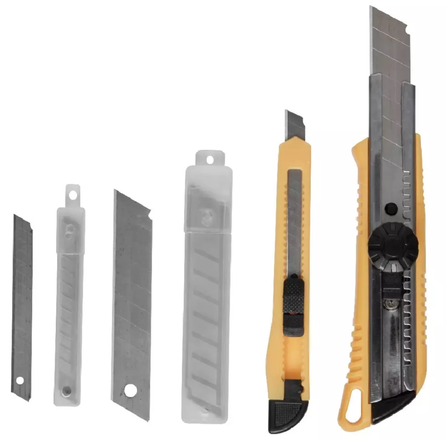 – Longueur des cutters 15,5 et 13 cm – Poids de l’ensemble 100 grammes – Inclus 6 lames de rechanges – Lames tranchantes rétractables en acier inoxydable.