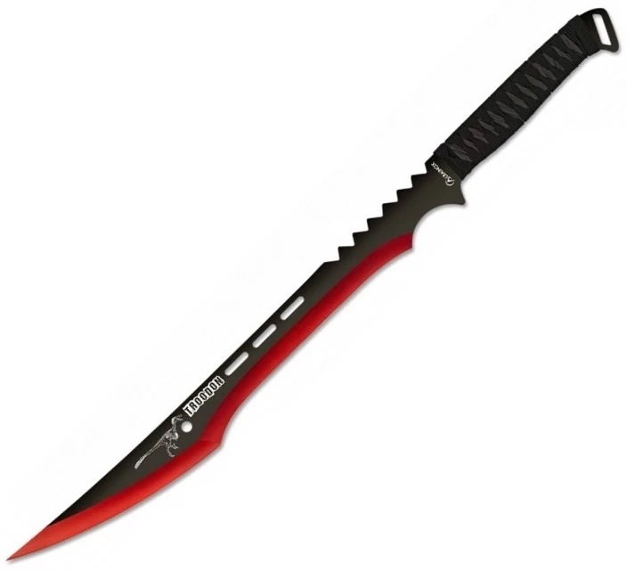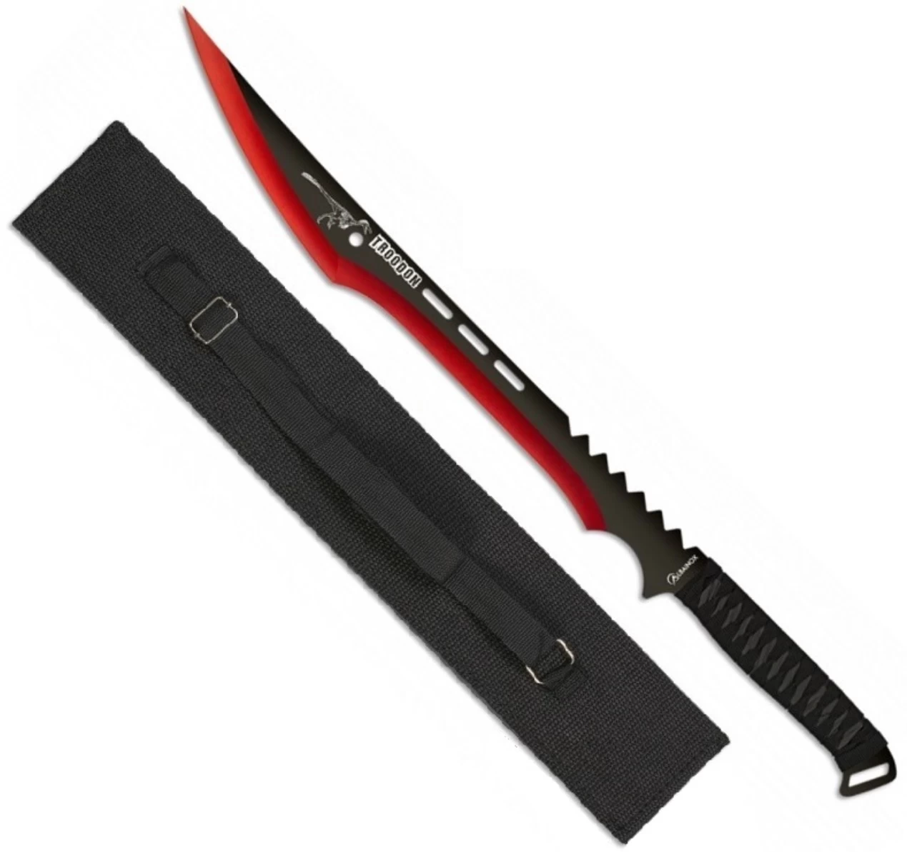 Avec une lame tranchante entièrement faite avec de l’acier inoxydable, cette machette épée est un outil que vous pourrez utiliser pendant de longues années. Il bénéficie d’une conception full Tang et ne dispose donc pas de soudures ou de points de jonction pouvant favoriser sa dégradation. Son manche antidérapant est recouvert de cordelettes de nylon pour faciliter sa prise en main et son utilisation. Grâce à cela, vous bénéficiez d’un grand confort et vous évitez les blessures, la douleur et les écorchures provoquées par une manche en mauvais état. La lame de 40 cm présente des décorations ninja de couleur rouge et noire. Cela confère à cette épée un design à la fois élégant et fantaisiste qui plaira forcément aux collectionneurs. Grâce à sa forme et à sa conception, il imite à la fois la machette, l’épée et le katana. Il s’agit donc d’un outil très original que vous pourrez utiliser de plusieurs façons.