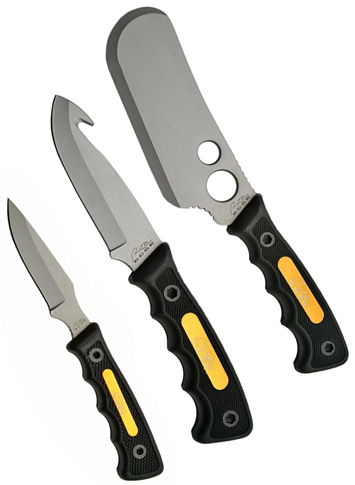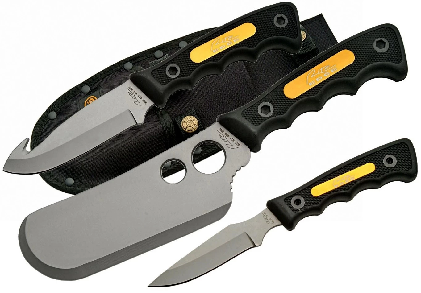 - Pack de camping – 3 couteaux poignards de survie : un couteau couperet, un couteau pour la pêche, un couteau multi usage et un étui de transport.